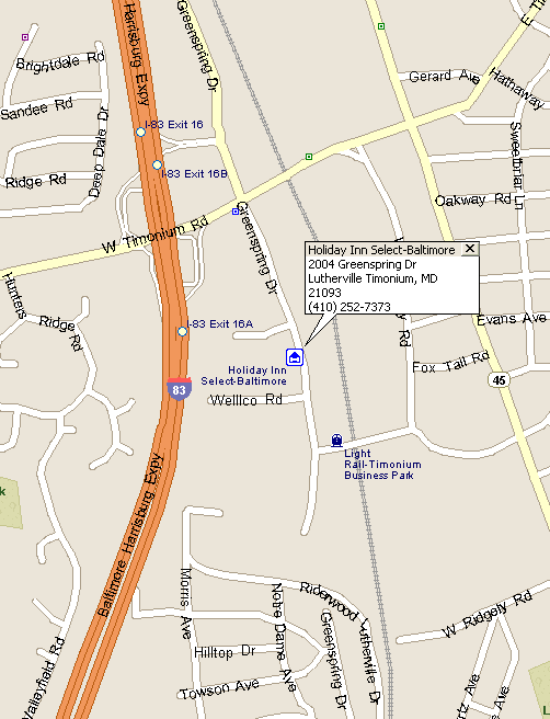 Turn right at the light onto Greenspring Drive and right again at the fourth driveway to the Holiday Inn Select (2004 Greenspring Drive)