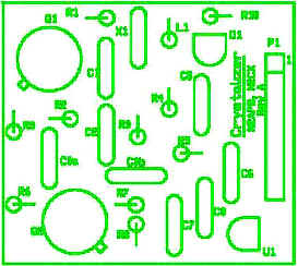 Construction of the Crystalizer is straightforward – just use the schematic as a guide for placement of the components at the silkscreened locations on the board. Resistors are mounted “on end” with the top lead bent over and going into the hole next to the bottom lead.