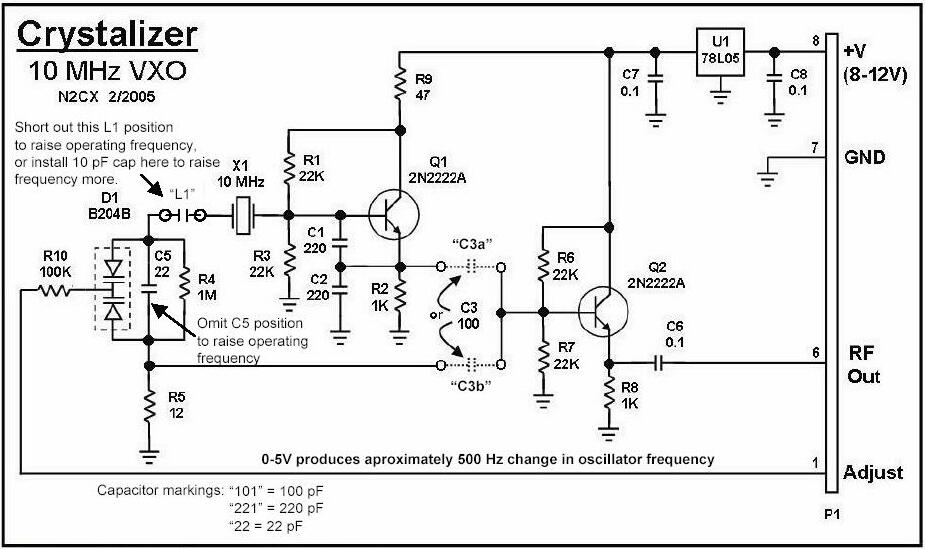CRYSTALIZER SCHEMATIC -- Note that we found it better to omit L1 and C5 in order to allow the frequency-adjustability range to definitely reach 10 MHz. Otherwise, with these parts in place, some units cannot quite reach 10.000 MHz when using the Adjust control input line. Thus L1 and C5 were not included in the second round of 200 Crystalizer kit shipments. The C5 spot on the board should just be left open, and the L1 pads should be shorted together.