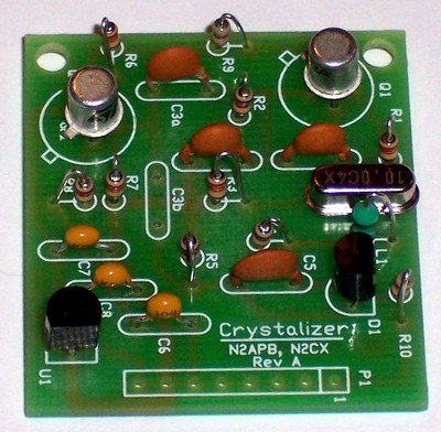 The Crystalizer produces an approximate 2V p-p signal at RF Out when C3 is in the top position (C3b on the pcb). This signal is quite ragged but very suitable for driving a balanced mixer like an SA612. (Think “producing a beat frequency with the WWV RF signal being placed on the other input of the mixer.”) When C3 is placed in the lower, “C3a” position on the pcb, a 200 mV p-p near-pure sinusoid is delivered at RF Out, suitable for transmission, after amplification, if desired.