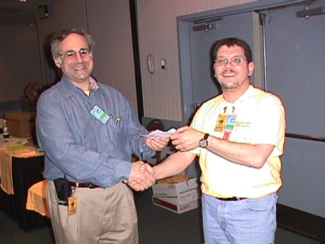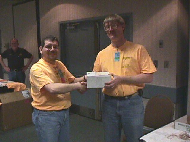 92. Prize Chairman N2SMH presenting a homebrew contest award (EMTECH NW80) to Jim, N8QOH for his W7ZOI Spectrum Analyzer contest entry