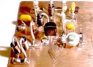 Notice the 2N2222A transistor with its emitter on the left soldered directly to the ground plane, and its collector on the right soldered to the trim capacitor being held up by the pads.