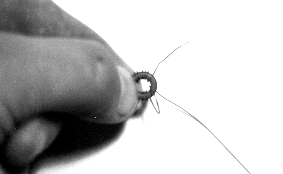 Once the specified number of turns have been placed onto the core, trim each end of the wire to such that they each extend about ½" from the body of the toroid. Next prepare ends of the wire for soldering by using an Exacto knife or equivalent sharp-edged tool to scrape off the enamel coating. You can then tin the ends by pressing a hot soldering iron tip to them and applying solder. A careful job here will ensure a good connection to the pads of the circuit. Position L1 over the pads you have located on the board for this component and solder the leads to the two pads.