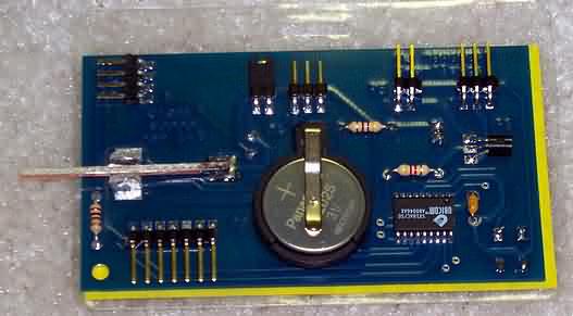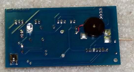 Morse-Annunciating SmartBadge In previous "Spotlight" installments of this column I’ve described the simple, fast and inexpensive SX microcontroller from Ubicom (formerly Scenix) in the form of the PSK31 Audio Beacon project. Then later in the pages of NorCal’s QRPp magazine I overviewed the design of another SX project, the serial logging frequency counter, using that same chip and board. Hoping that QRP readers find these SX-based projects interesting and quite reproducible, I present this time a unique application of this PIC-like microcontroller in the form of a Morse-annunciating callsign badge. The Badger, as it is called, consists of a piezo sounding device and a SuperBrite LED on the front of the pc board, and a small pushbutton that is used to start the beeping and blinking of the owner’s callsign. An SX-18 microcontroller and several other components also reside on the board which is overlayed with a custom-designed laminated callsign badge. A 3V lithium battery is provided on the pc board, allowing the annunciating badge to be operated free of an encumbering heavier battery. Add a common badge clip and the Badger can be worn at club meetings and other ham radio events to the amazement of everyone! FEATURES • Badge size - pcb is 2" x 3.5", laminated overlay is 2.5" x 3.5"; • Piezo - approximately 4 kHz, adjustable for peaking to individual unit; • LED - a red SuperBrite LED • Pushbutton - micro-size, initiates annunciating sequence; • Annunciation - piezo and LED are modulated using Morse code at given speed to announce callsign and other features; • Key/Paddle - pads on pcb are provided for builder to add a miniature, on-board homebrew key or paddle, and signals provided off-board via 3-position pin header connection; • Keyline output - buffered output line delivers Morse to external transmitter via 2-position pin header connection; • Expansion connector - provides access to special functions (described later herein), accessible by 7-position pin header; • Programming connector - 4-position pin header connector allows user to connect the SX-Key or SX-Blitz programming tool for custom programming of the SX micrcontroller chip. • Operating modes - annunciate callsign via piezo and/or LED, repetitive "beacon mode", iambic keyer, keyer speed adjust, piezo tone adjust and straight key tone oscillator; • 3V lithium battery - standard watch battery provides circuit power . SX chip "sleeps" during quiet times, ultimately providing infrequent need for battery replacement. HARDWARE Refer to Figure 1 for the following discussion. The SX-18 microcontroller contains the software program that provides all the features of this project. Clocking for this chip is provided by an on-chip RC oscillator. Timing accuracy of the tones frequency and the Morse code speed is not overly critical so we can live with slight chip-to-chip variations in clocking rates when using the built-in oscillator mode - this is a nice price to pay for reduced parts count! Power is normally provided by an onboard 3V lithium battery when Jumper J1 is in place as shown, or by an external 5V source when J1 is in the pin 2-pin 3 position on pin header P3. External 5V is required only when a new program is being burned into the SX chip. This "in-circuit programming" capability of the SX device makes it very easy to re-use in projects. When the Badger smart badge is quiet, the SX controller is "asleep". In this state, the SX clock oscillator has stopped and the chip only draws several microamps of current from the 3V battery. However when the smart badge is triggered by pushbutton PB-1 being actuated, the SX chip wakes up and begins executing its internal software program. Turning the smart badge on by means of a quick tap is reminiscent of the activation scheme for the communicator worn on the shirt in the old Star Trek series ... "Beam me up Scottie!". Once triggered, the program in the SX chip wiggles the output bit RB1 at about a 4 kHz rate, causing piezo device X1 to emit a reasonably loud tone. The software program modulates the tone with Morse code at about 15 wpm rate to sound the owner’s callsign. The RB2 output pin is also turned on and off at the same Morse code rate and buffered by transistor Q1 to drive the KEY input of a transmitter. In this way the Badger can key a transmitter, which will be seen as a more useful feature when we describe some other Badger features in a moment. LED D1 is also turned on and off according to the Morse code being sounded, giving visual indication of the callsign being announced. The blinking SuperBrite LED is very useful in helping to one copy the Morse code. The specs for the piezo state that the sound pressure generated (i.e., audio output level) is at least 80 dB, which is pretty easy to hear in a typical environment. However when the room is filled with talking people and other noise, the beeping can easily be drowned out. Thus LED blinking in time with the sounding of the piezo greatly helps by correlating visual and audible inputs to person trying to copy the callsign. Paddle inputs are available for connection of a standard iambic paddles, enabling the SX chip to perform as a keyer. When the smart badge is placed into "keyer mode", grounding of the dit or dah input lines (SX ports RB4 or RB5, respectively) activates the piezo and LED for the corresponding dit or dah time periods. Another related mode, Straight Key mode, instructs the SX program to recognize grounding of the dah input pin as a straight key closure, which in turn sounds the piezo and turns on the LED. The Badger pc board was layed out to allow the builder to construct a miniature homebrew paddle right on the back of the smart badge. As shown sticking out on the left of Figure 2, a thin strip of pcb material is soldered in between two grounding stubs such that when the strip is moved from side-to-side by the operator’s hand, the Badger sounds off just like a code practice oscilla