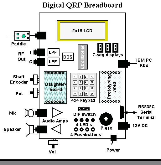 BLOCK DIAGRAM & BOARD LAYOUT The diagram shown below illustrates the component layout for the Digital QRP Breadboard. The board size is 6”x9” and contains most of the components needed for the various projects planned in the coming issues. Because of uC I/O port limitations, not all capabilities can simultaneously be available, but you’ll be able to set jumpers to allow various combinations (e.g., LCD or 7-seg displays, keypad or keyboard, etc.) A prototyping area is available to allow addition of your own components for that “special” application you have in mind. Further, a unique feature is the daughter board area to the left of the keypad. We’ll use this “plug-in” board in future columns to add some specialized functionality – e.g., a DSP pre-processor to beef up signal processing capabilities, a PLL to serve as the basis for a stable VFO, etc.