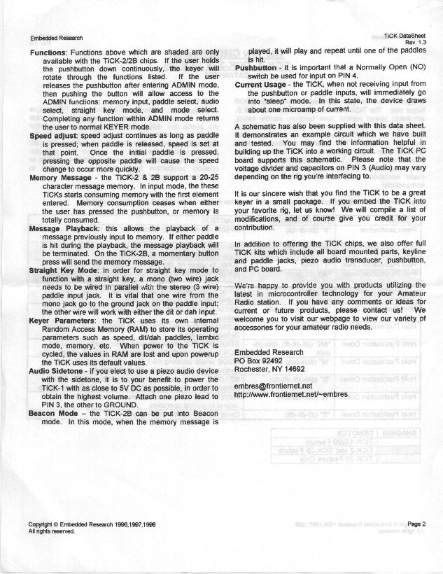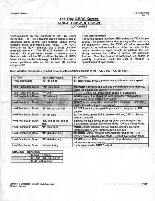 - Shipping & Handling (only if any options are ordered)TiCK Data Sheets (page 1 and page 2)... the Embedded Research guys gave us permission to post the two sheet instructions on programming the TiCK-1, 2 & 2B keyer chips. So if you missed getting the TiCK data sheets in your FB40 order, click on these links to view the sheets.