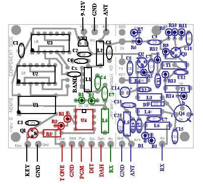 The parts in blue are those optional ones comprising the RF amp and its T-R switching circuit;
