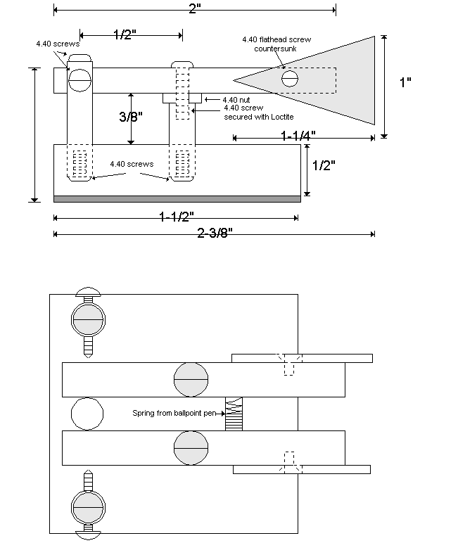 By carefully adjusting the bolt and nut, I was able to get a pretty smooth swiveling motion on the paddle arm, but the bolt still wobbled about in the 4.40 thread. A tiny drop of LocTite solved that problem. The mechanical details are shown in the measured drawings which are much larger than full-size.