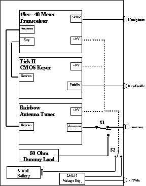 I have not calculated the power drain on the 9V battery. This configuration may be too much for it to supply for more than an hour or so. When I get further along Ill decide if another type of battery will fit the enclosure. For now the external 12V source regulated through the LM317 (set to 9V) should provide weeks of operation on a small gel cell.