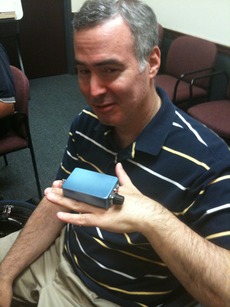 AB2ZA brought a number of projects including a beautiful 20 watt power amplifier (See photos below) in an Altoids tin. He used 2 RR510 switching MOSFETS, which he described as being VERY cheap! 2-3 watts in provides about 20 watts out. He also brought the prototype of a PSK31/PSK63/Morse decoder that will be kitted and sold by Steve "Melt Solder" Weber KD1JV. Details: http://kd1jv.qrpradio.com/decoder.pdf The device draws "extremely low power" on use, and would run off a C-cell-size Li-Ion battery "for a year!" Vojtech also showed some small AAA replacement batteries with built-in charging circuits that can be recharged using a USB cable.