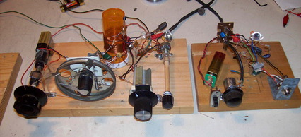 AB2FG's regen radio for 80 meters based on design by Charles Kitchin, N1TEV, in Nov/Dec 1998 QEX. This is a work in progress, lashed together to get a feeling for how well the circuit works. Answer: amazing performance for such few parts. Larger board to left is RF portion: RF amp and detector. Smaller board to right is quick-and-dirty audio amp. His plan is to pretty this up into one box and eventually pair with a to-be-built QRP CW transmitter