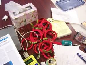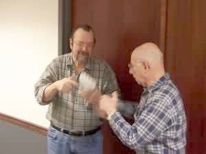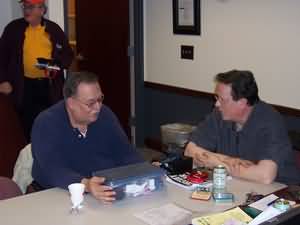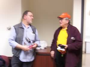 Ron McConnell, W2IOL showed off some nifty superbright LEDs that he obtained from Walmart, Walgreen and Sears. LEDs were attached to his hat and to a glove, making hands-free visibility possible in low-light situations. So whether you are night time QRPer, a proctologist, or just hunting under the bed for spiders, you should check out these items.
