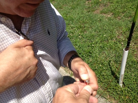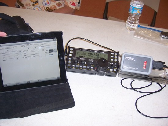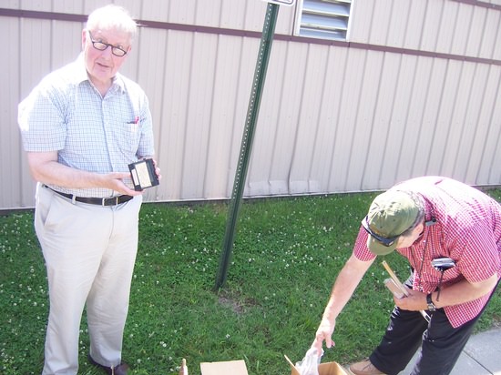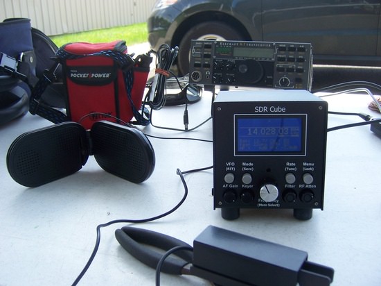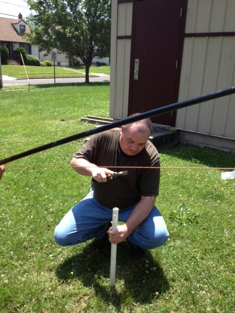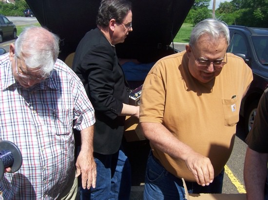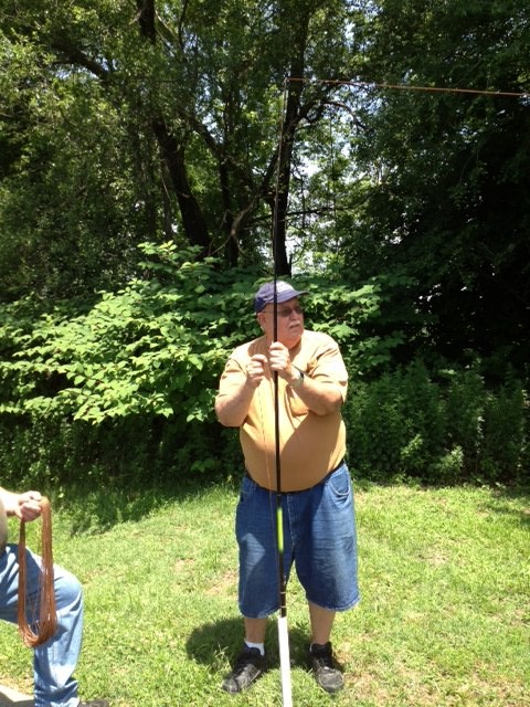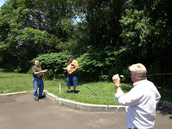 3) The Field Day Station -- N2CX, N2APB, N3PUU and K3KW set up the main station out in the Community Center parking lot: Elecraft K2, SDR Cube and FT-817ND, an Elecraft T1 ATU, with a G5RV multi-band dipole on a 28-ft Jackite pole. The antenna checked out pretty good for resonance on the usual bands, using the Micro908 Antenna Analyzer. This is an amazing antenna (G5RV), and an even after all the years same too for the Micro908! The ends of the antenna were supported by a couple of short crappie (fishing) poles. We had some instruction for a few who stayed after the meeting and it was fun sitting at the station and tuning around during the pre-Field Day times on the air. Then after a wonderful lunch break graciously supplied by Kathy, the lovely XYL of Frank N3PUU (and mother of his very cool little harmonic John!) we began using the setup. Joe, Frank, Howie and George started working the FD event from there for the rest of the afternoon out in the gorgeous weather!