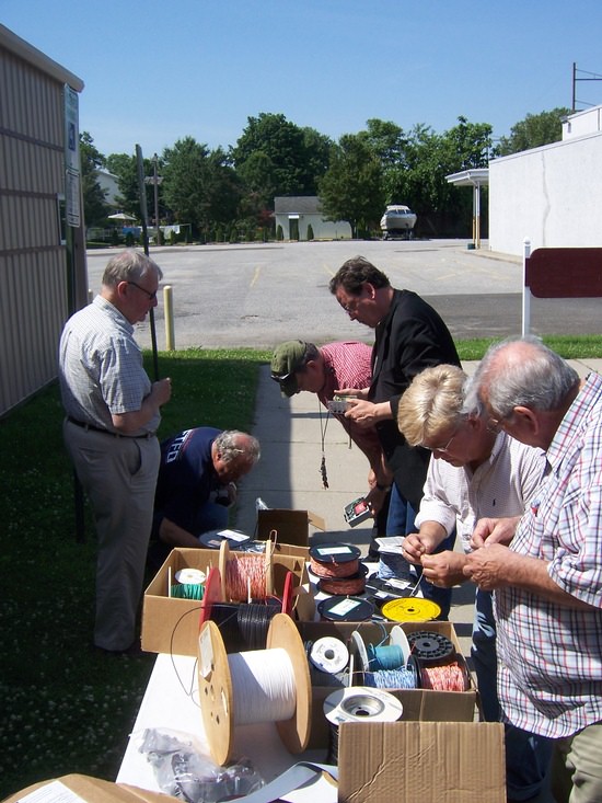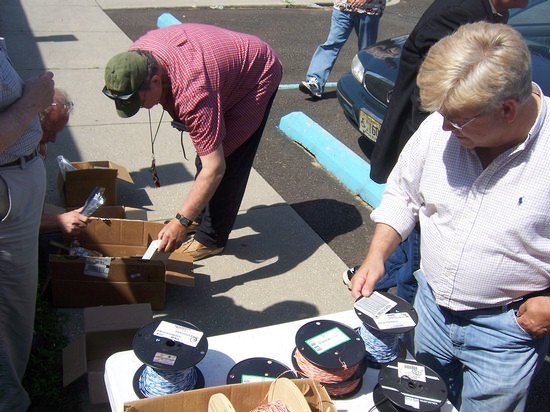 2) The Outside "Wire Fest" ... We brought a large table outside and filled it profusely with all sorts of wire donated by a friend of the QRP community. There was some great(!) wire there: thin, multi-conductor, shield "mic" cable, twisted pair, RG-174 coax, flat cable, high-voltage cable, thin hookup wire ... you name it! And these were BIG spools of each type, such that we were all stumbling over each other pulling off long lengths for personal use. We also had some nifty "junk box"-category stuff, just right for homebrewers looking to scrounge some good parts: 5-way binding posts, switches, 100-turn pots, cabinets, die-cast enclosures, connectors, and more. Once again, "thank you" to our benevolent homebrewer in the QRP community!