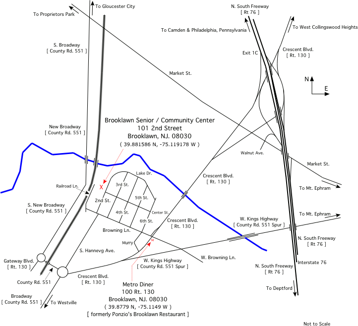 3. From PA and Philadelphia areas - Follow Rt 76 east to the Walt Whitman Bridge and cross over into NJ. Take the Rt 130 South exit (second exit off 76). Go 0.7 miles south on Rt 130 to Browning Rd (or Ln). (See the "Metro Diner" on corner - the location of our pre-meeting breakfast.) Turn right onto Browning and go 5 short blocks to 2nd Ave. Turn right and the Brooklawn Community Center is a couple hundred yards on the left at the far end of an asphalt parking lot. Plenty of parking.