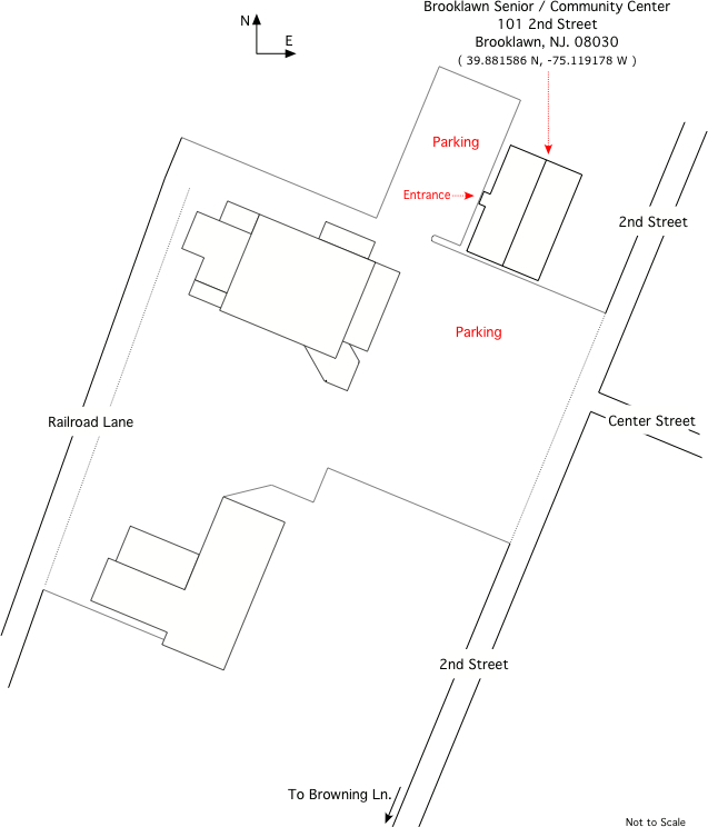 1. From the Princeton/Trenton area - Take Rt 295 south to Rt 76 (Phila exit). Go west on Rt 76 for 0.3 mile and the first exit onto Market Street. Turn left on Market and go about 0.3 mile then turn left at the second traffic signal onto Rt 130S. Go about 0.7 miles on Rt 130 to Browning Rd (or Lane). (See the "Metro Diner" on corner - the location of our pre-meeting breakfast.) Turn right onto Browning and go 5 short blocks to 2nd Ave. Turn right and the Brooklawn Community Center is a couple hundred yards on the left at the far end of an asphalt parking lot. Plenty of parking.