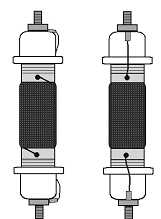 To wind the coil, the wire is passed through one set of holes in the PVC riser and soldered or crimped to the ring terminal under one bolt. If you plan to solder the terminals, the plastic sleeves on the crimp portion can be removed to expose the metal. Once the end of wire is secured, begin winding around the PVC while keeping the turns in close contact. An easy to do this is to rotate the coil form with one hand while using the thumb of the other to feed the wire onto the form. If you need to stop winding before completion, electrical or masking tape can be used to secure the already wound turns. Continue winding to the indicated number of turns while keeping the windings close spaced and tight and secure the wire by passing through the other set of holes and connecting to the ring terminal on that end.