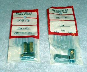 In order to attach the whip to the loading coils, an adapter is prepared from a 5/16" coupling nut that is drilled using a 9/32" bit for approximately 1/2 of its length. The depth is chosen to allow the antenna to slip into the fitting to just past the upper crimp line. At a distance of 1/8" from the top, it is drilled and tapped for a 6/32" screw that will serve to secure the whip. See Figure 1B.