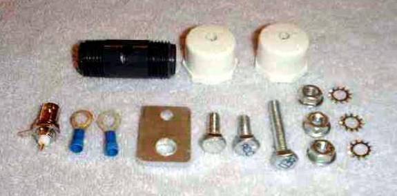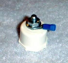 The end cap for each coil consists of a threaded PVC cap that is drilled for the end bolts. Make sure to select PVC caps that are flat on top. Some manufacturers have the top of the screw on cap domed and this will cause problems when assembling the coils. For each coil, one cap has a 1/4 x 3/4" bolt, and a 5/16 x 3/4’ bolt. The 1/4" attaches to the antenna base sections, and the 5/16" connects to the whip base. Each bolt is passed through the cap and a ring terminal, star washer and nut are added. Tighten the nut to secure the ring terminal and prevent the bolt turning in the cap.