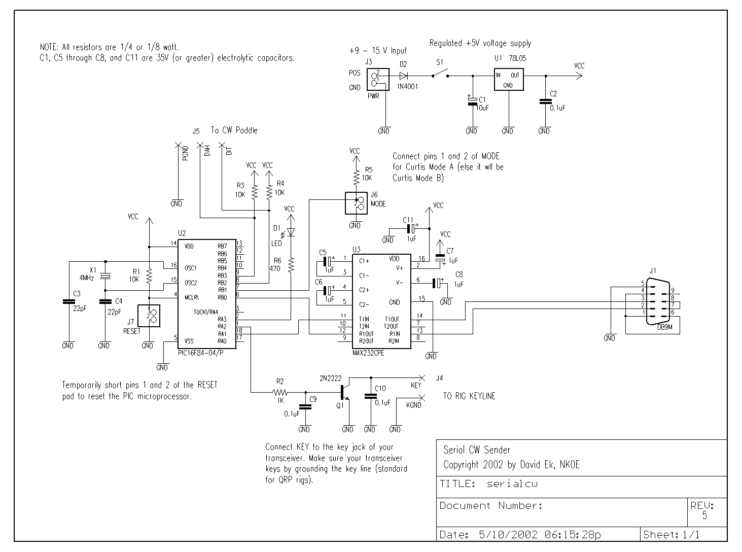 To use the Serial CW Sender with your PDA, you’ll need a serial cable connection between your handheld computer and the Serial CW Sender circuit. Palm, Inc. sells serial HotSync cables for all of its handheld computers and these should work for connecting the Sender to your Palm PDA.