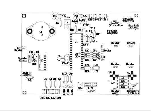 ![]() PCB Top: Power regulators (upper left), PIC #1 for shaft encoder (left), PIC #2 for VFO control (middle), control pushbuttons (top & bottom) and status LEDs (top). [Proto PCB shown Production version has solder mask and silkscreened component lengends.] |