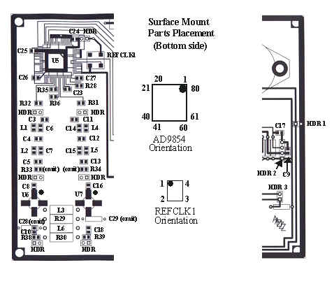![]() PCB Bottom: AD9854 surface mount DDS integrated circuit |