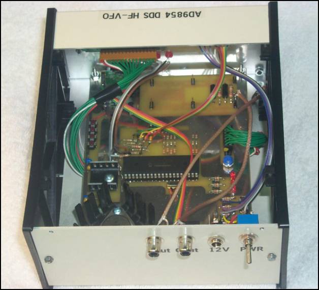 ![]() This inside view of the enclosure shows the HF VFO pc board to be a tight fit front-to-rear, but cable to the controls, display and connectors is easily accomplished above the board. The panel-mounted pushbuttons and LEDs are wired in parallel with their board-mounted counterparts. |