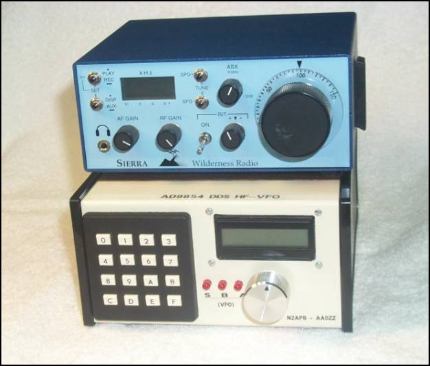 ![]() Here’s the front view of the stacked pair: the Wilderness Radio Sierra QRP transceiver (top) and the AA0ZZ 9850 High Performance HF VFO (bottom). During operation, frequency tuning is done (and displayed) on the external HF VFO, while the dial and display on the Sierra is not used. |