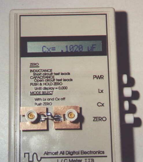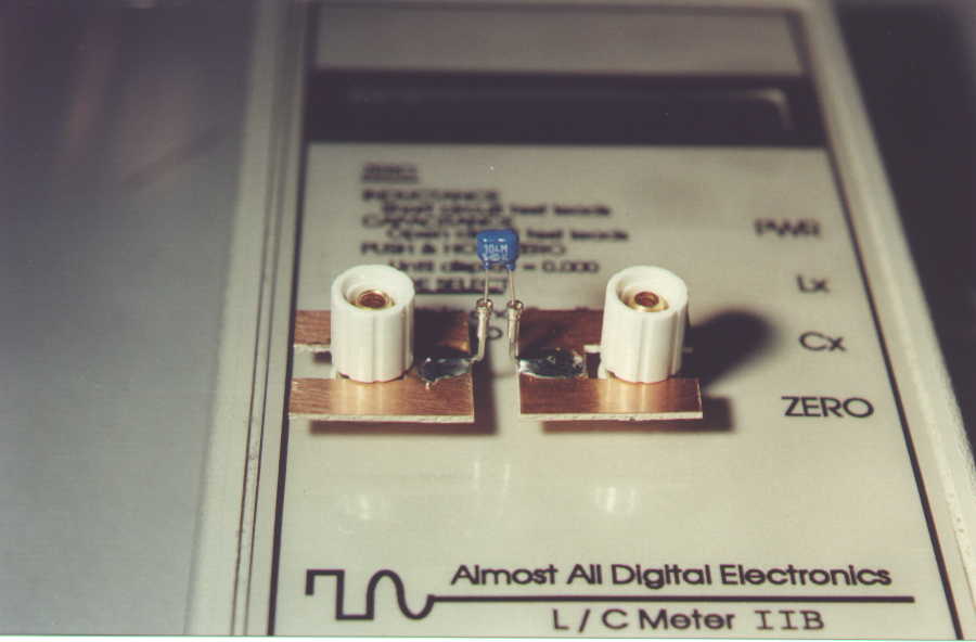 photo 9 K7QO test jig with 0.10uF cap being measured |