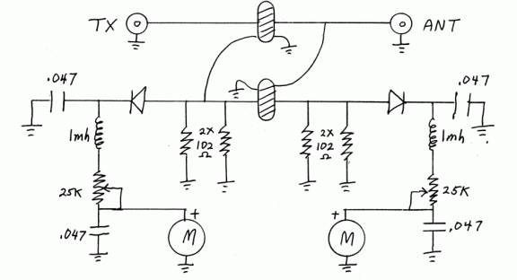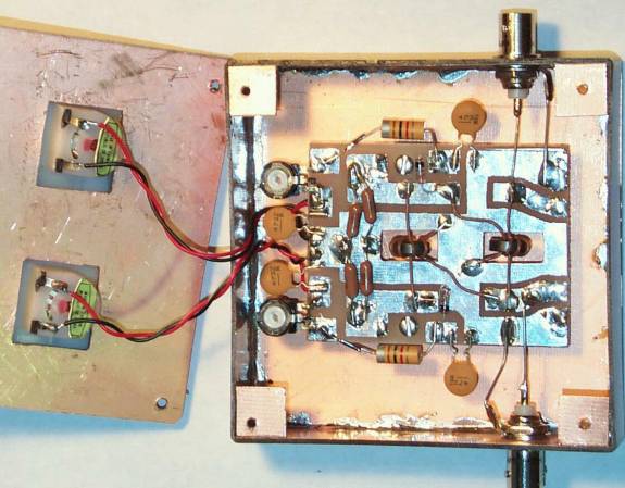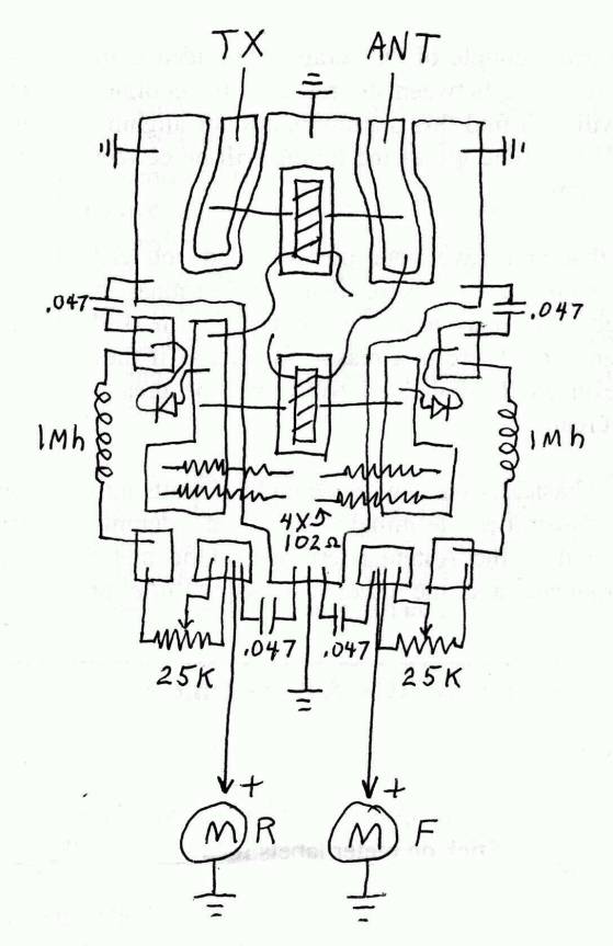Inside the enclosure shows horizontal orientation of components (for height reasons) and direct wiring to the BNCs. Be careful of the exposed transmission line in thebox! Note the simple holes for meters, epoxied to the front cover plate.