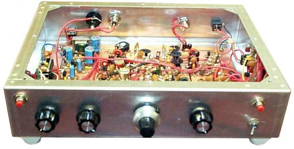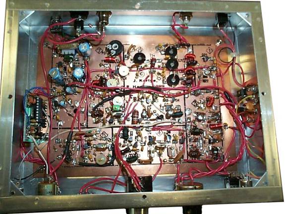 Top view of AD2A’s homebrew 2N2/40 Transceiver. Orienting the main board flat on the bottom of the aluminum chassis provides easy access to components and wiring during final wiring and troubleshooting. When in use, a simple aluminum (or copper-clad material) plate is screwed to the top.