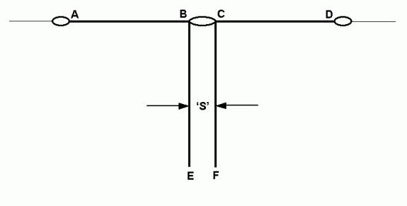 Figure 1: A basic doublet antenna. The flat-top sides AB and CD are equal, as are the feeders BE and CF. Spacing ‘S’ is explained in the text.