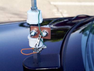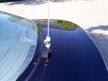 ![]() Figure 2: Antenna mounted on Hertz rental car with feedline running alongside car up to the rig. |