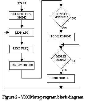A simple flow chart for the VXO-Mate is provided in Figure 2. The VXO voltage and frequency are monitored and displayed on the LCD screen each time through. After the LCD screen one of the built-in QuickieLab pushbuttons is checked. If it is depressed, a mode change is made. In this mode, the same voltage and current readings are annunciated in Morse code on the QuickieLab loudspeaker. The cycle starts over again with new readings and once more the pushbutton is checked after the LCD display. If it is depressed the mode toggles back to the LCD only mode. If not, the program remains in the “sight and sound” mode.