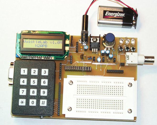 The QuickieLab is a 4.5” x 6” circuit board with keypad, LCD, switch