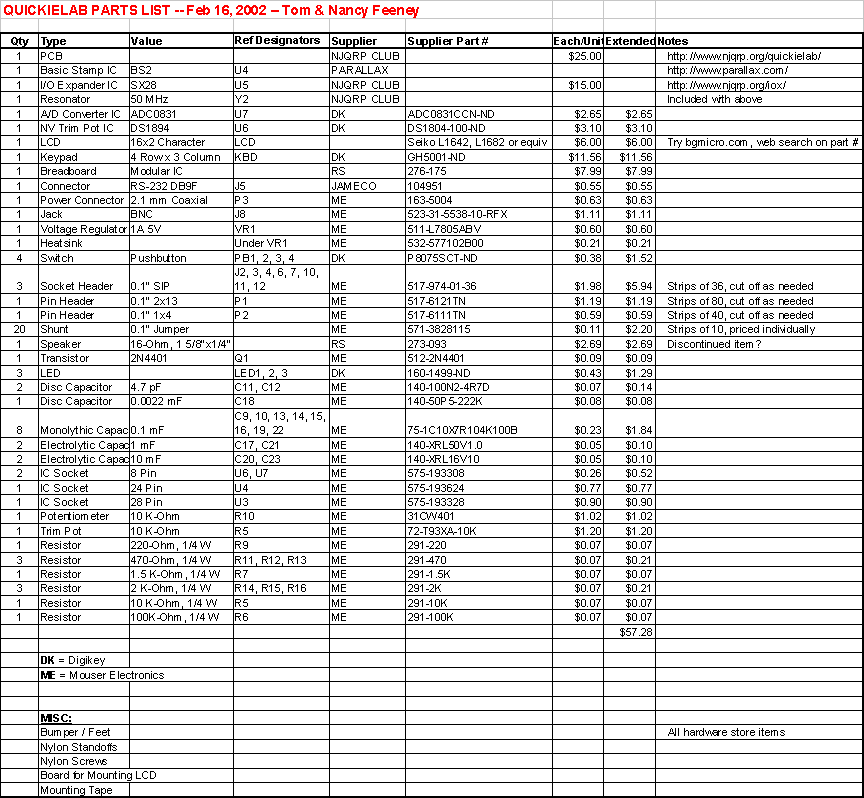 Readers wishing to follow along with N2CX and his BASIC language experiments could certainly purchase one of the many fine Stamp-based experimentation boards from Parallax.com and have a ready-to-go hardware platform with most of the capabilities described here. However, one could save quite a few pennies by building the QuickieLab and ending up with a more capable platform that is specifically geared to the growing number of Joe’s Quickie experiments.