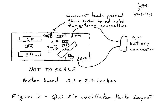 The circuit here is a step up from the original quickie. Figure 1 shows the circuit. It's a bare bones twin-tee audio oscillator adapted from a variety of circuits in the last 20 years of hobbyist and ham publications. My wrinkle is that you really don't need to put it on a printed circuit board and enclose it in a fancy case. Mine is built on a scrap of Vector board. See Figure 2 for parts layout. Nothing is critical about the construction. Using a snap-on 9V battery connector almost eliminates the power switch.