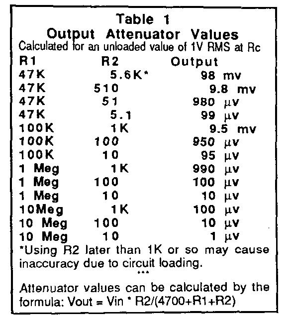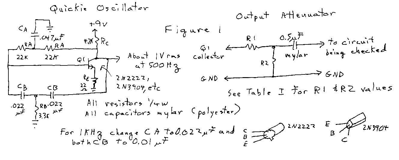To use the quickie, just tack solder on a resistive divider to get the level you need. Resistor values for various levels are given in Table 1. Connect the signal to the circuit you're checking with short leads and a 0.5uF Mylar coupling capacitor.