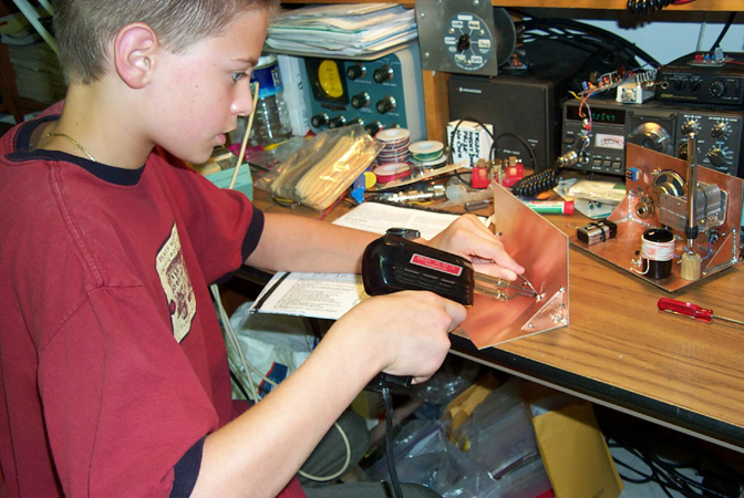 Take a look at the FRONT view, the REAR view and the LAYOUT diagram we used for the construction. Also see one of the scouts, Mark, at my radio bench starting the assembly of the copper-clad pcb material we used for the chassis.